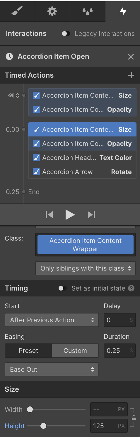 To adjust the height of the open accordion panels, you'll need to first edit the Accordion Item Open interaction, then adjust the Height value inside the Accordion Item Content Wrapper element.